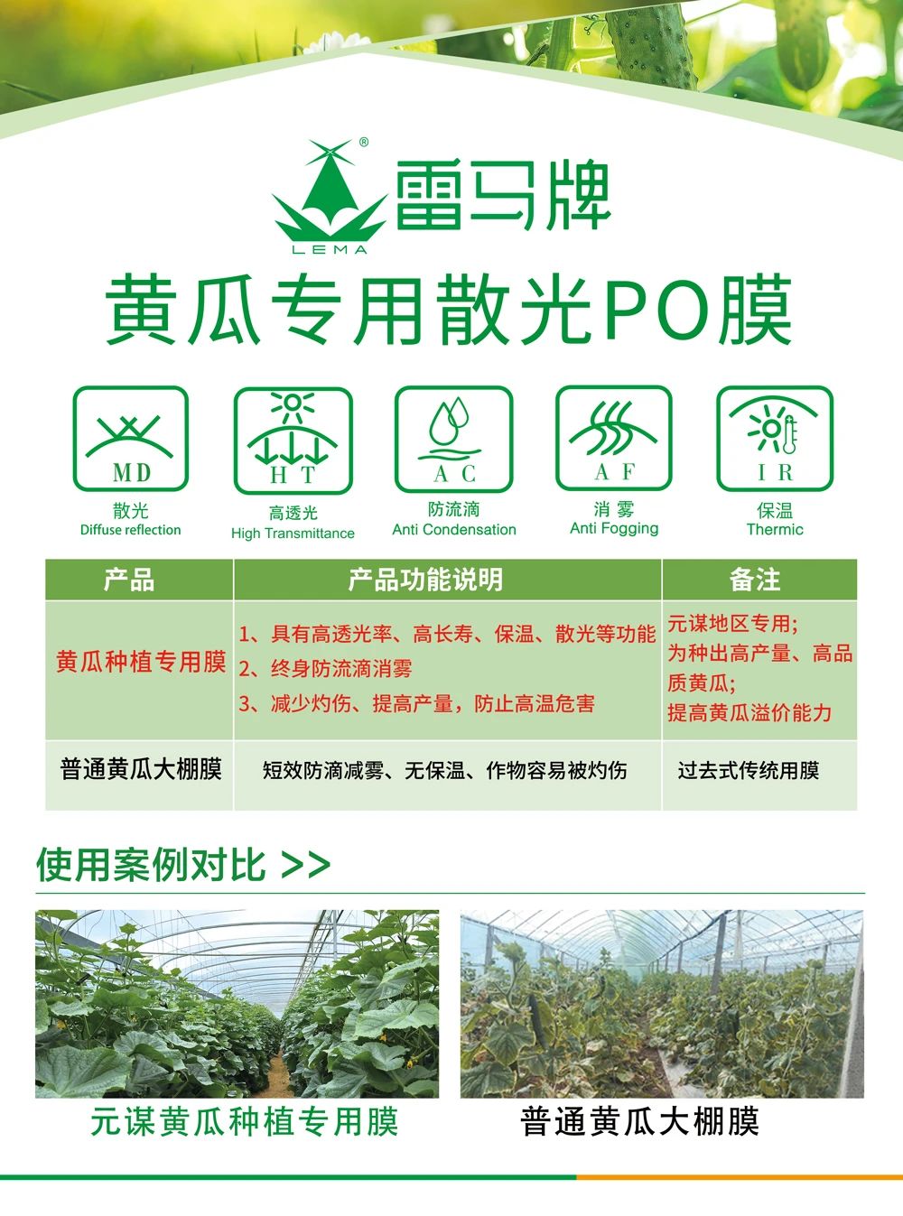 中欧体育黄瓜专用散光po膜已在云南元谋、宾川等地广泛应用,且增产增收效果明显,能够增加黄瓜的前中后期产量,投入产出比也大幅提升。